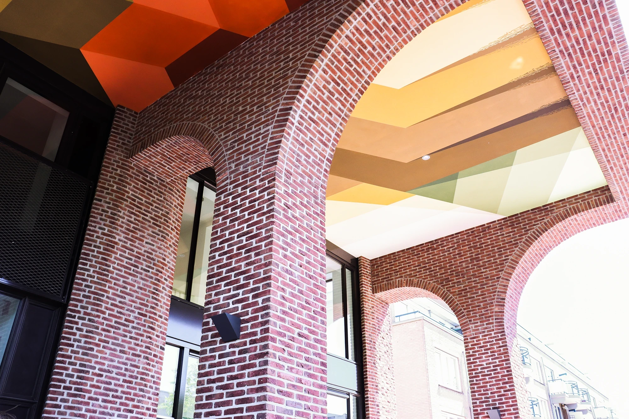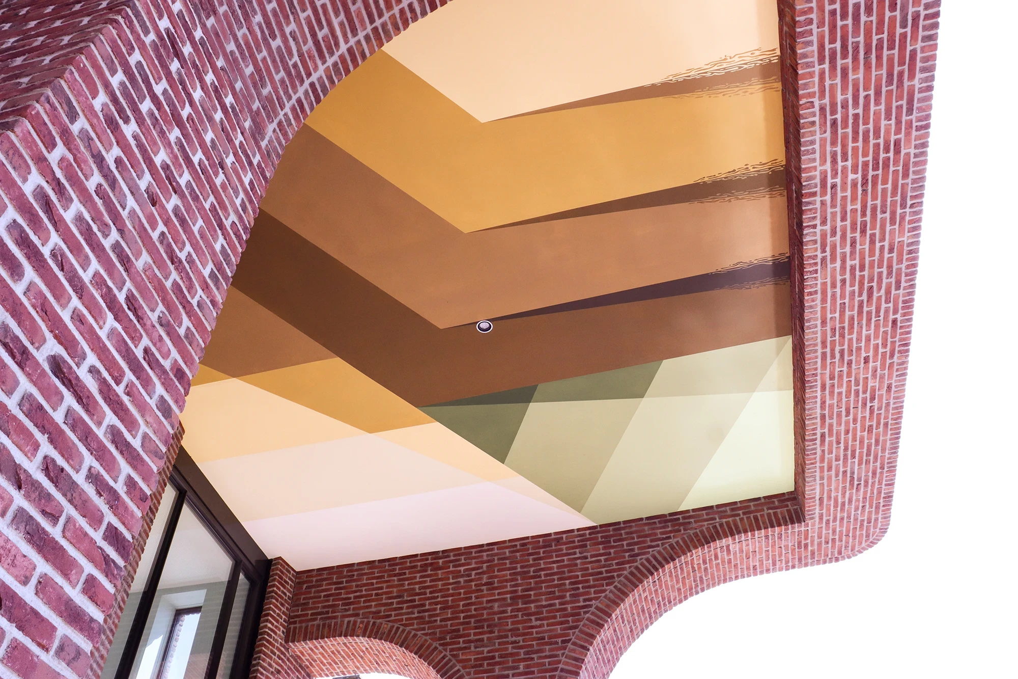 De opdracht omvatte het realiseren van een tweedelige muurschildering op het plafond van twee naast elkaar gelegen doorgangen in een openbare wandelroute bij een lokaal park. De briefing vroeg om een ontwerp dat aansluit bij de omliggende stedelijke architectuur en tegelijkertijd thema’s oproept als gemeenschap, verbinding en integratie met de natuur. De schildering werd direct op het stucwerk aangebracht met duurzame, weerbestendige materialen, en is ontworpen om vanuit meerdere hoeken en over een langere periode bekeken te worden—met als doel reflectie en nieuwsgierigheid op te wekken. Met dynamische kleurvlakken en vloeiende geometrische composities transformeerde Mr. June de ruimte tot een levendige, contemplatieve doorgang—zowel een opvallend visueel herkenningspunt als een symbool van gedeeld eigenaarschap binnen de buurt.