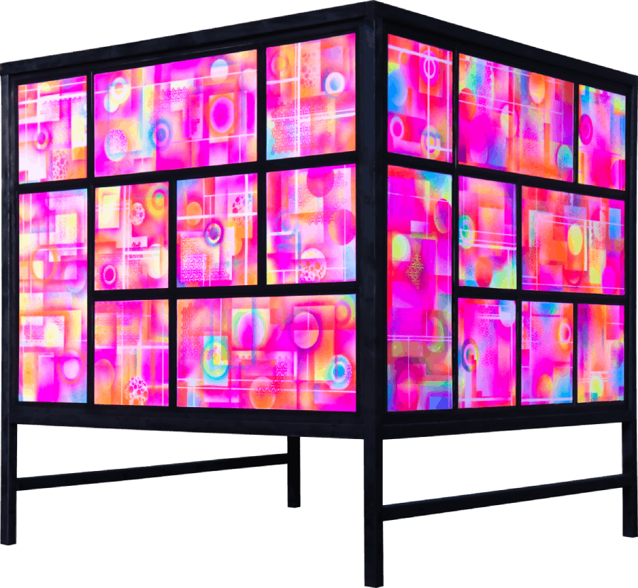 Tony omschrijft 36 chambers als duizend kunstwerken in één. Elke keer dat het licht verandert, ontstaat er een nieuw schilderij. Aangezien het licht iedere acht seconden verandert, valt er hier een hoop te zien. Dit ecovriendelijke werk fungeert ook als lichtbron. 36 chambers is eind 2022 aan onze collectie toegevoegd om extra warmte te bieden tijdens de donkere wintermaanden.