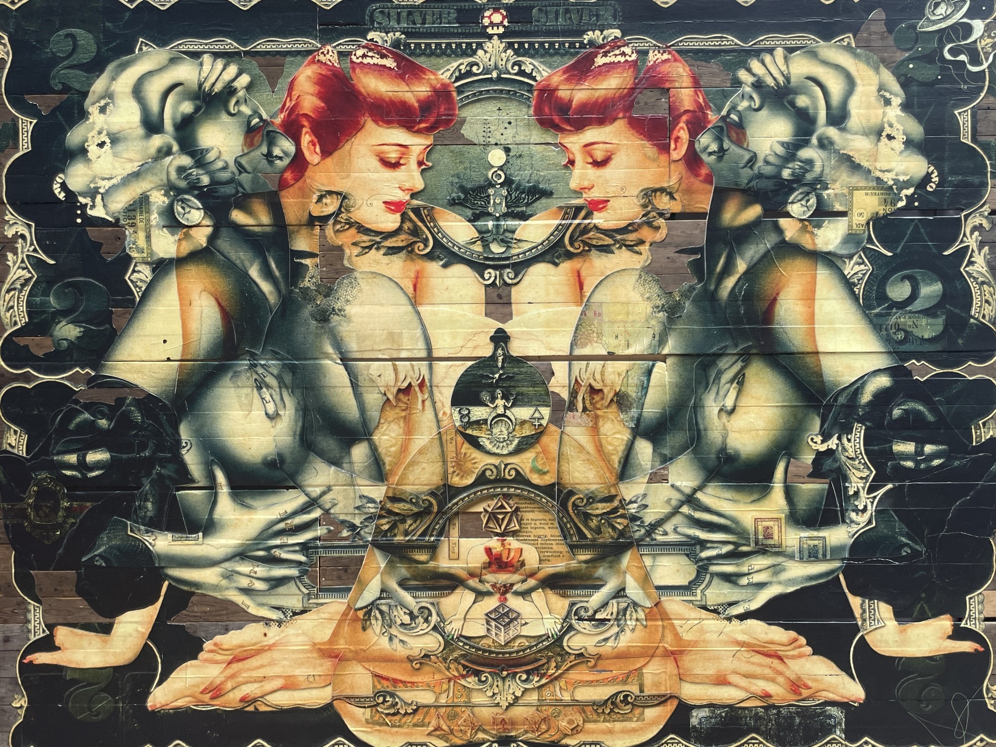 Het kunstwerk Goddess in Us heeft een vrouwelijke hoofdpersoon, wat vrijwel altijd het geval is binnen het oeuvre van Handiedan, maar nodigt iedereen uit om hun vrouwelijke energie aan te spreken. De warme, krachtige viridiaanse tinten en de symmetrische compositie zuigen je het kunstwerk in. De belangrijkste boodschap is dat alles energie is, iets waar de spirituele kant en de wetenschappelijke wereld het uiteindelijk over eens zijn. Het zit ook vol persoonlijke details, waaronder het handgetekende personage Amélie, weliswaar geïnspireerd door de film, maar ook een vertegenwoordiging van de mens Handiedan.