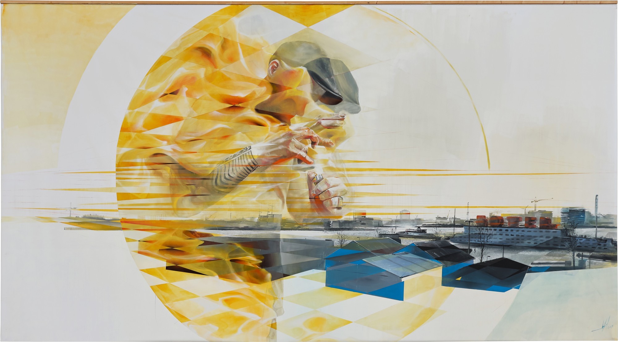 In Apollo, Vesod represents the surroundings of STRAAT in his characteristic multi-layered background, which illustrates his research in time, form and space. This artwork - as the title suggests - is centered around the Greco-Roman god of the sun. The flame coming from the lighter in his hands is a reminder of the temporal nature of life.