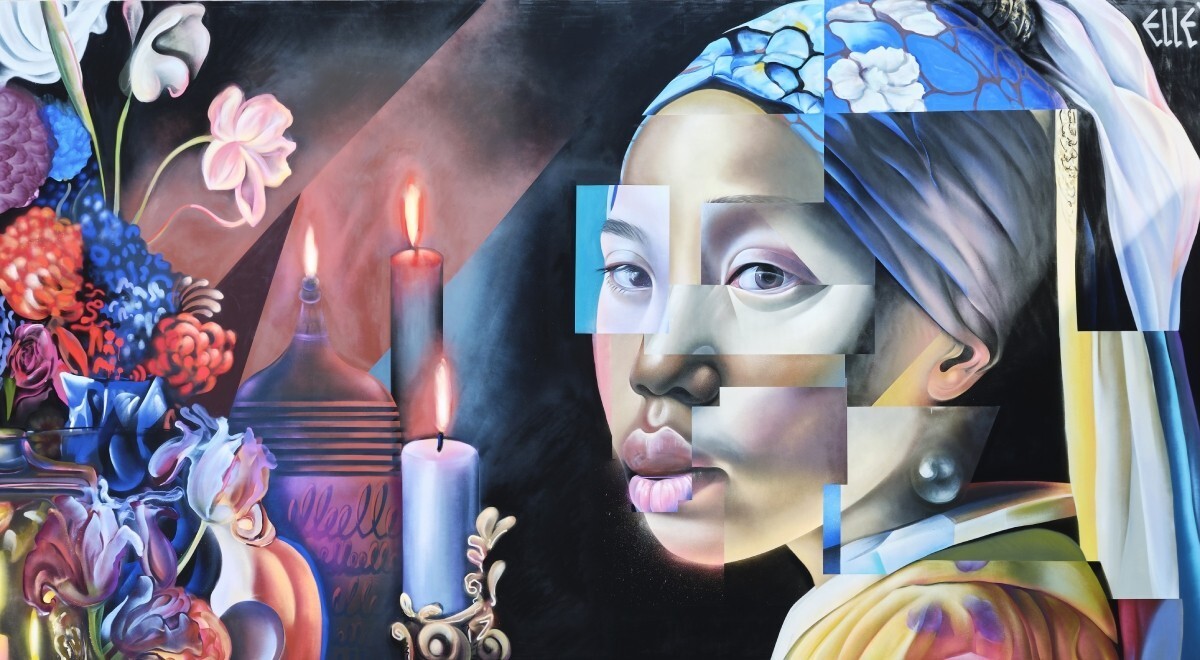 While she continues to tour the world painting globally, her visit to STRAAT marked an interesting moment in her career, as she had started gravitating more towards AI, glass blowing and sculpture art. ‘Girl With A Pearl Earring; Contemporary AI Remix’ is actually the first work for which she designed a sketch in collaboration with AI. This came with a few technical hiccups ELLE purposely kept. See for instance the ‘off’ eyelid, the odd flowers, or the ear blending into the hat. She references this very particular moment in time where AI is in a “toddler” stage, making funny/illogical mistakes - which surely won’t last long. ‘Girl With A Pearl Earring; Contemporary AI Remix’ references two moments of Dutch Art History: the Vanitas movement and Vermeer’s Girl With A Pearl Earring”. The painting is done entirely of spray paint in ELLE’s typical collage style, and with more diversity, implying that inclusion is a strong point of Dutch society now.