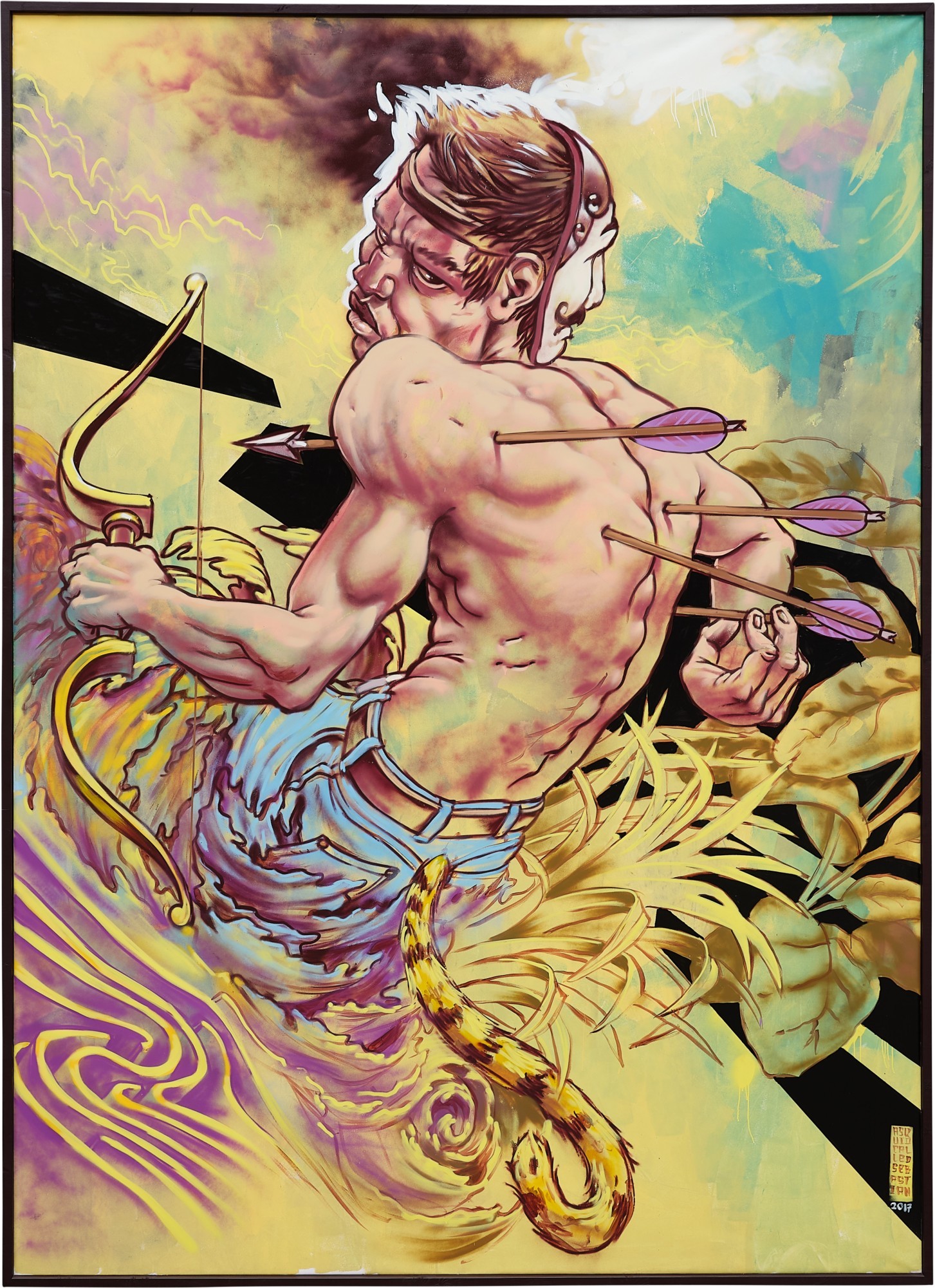 “This painting revolves around the idea of mankind as predators but with themselves as their own greatest natural enemy. The character wears a mask on the back of his head, which was done by lumberjacks in India to protect themselves against tigers. But this obviously does not protect one from arrows in the back.” / A squid called Sebastian
