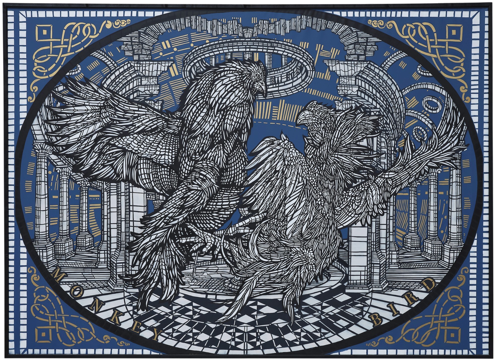 MonkeyBird’s alias reveals a lot about this French street art duo formed by Louis Boidron and Edouard Egea. Their artistic name incorporates their two distinct totemic personalities: Tremor the Monkey, representing realism and the physicality of the body, and Blow the Bird, representing the dreamer and the spirituality of the soul. It is a name that symbolizes their constant play between dream and reality, both in their personal and professional lives. This dream-reality shift is transposed into MonkeyBird’s hyper-detailed and monumental representations that capture a balanced universe caught in a continuous state of flux. Using the metaphor of a chess game, this canvas captures the tension between individuals in society.