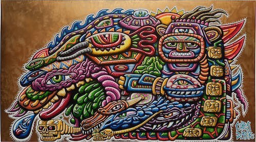 In Shamanic Journey, Chris painted this imaginary creature which he visualized after taking the hallucinogenic drink ayahuasca in Peru. It represents one entity made of several characters. This beautiful unison of different emotions is a totem, symbolizing his many inspirations, from traditional Peruvian sculptures to video games.
