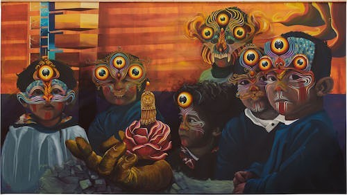 “The hand builds, destroys, sows, creates, curses and blesses. This piece revolves around seven characters that symbolize fire, the element that overcomes darkness and cold, which represents change, purification, and sacrifice. It talks about dream beings guarding ancestral wisdom, reminding us that the divine has infinite forms.” / Gleo