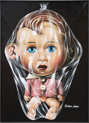 Sipros is renowned for his realistic portraits of characters with big ears, which resonate with our inner child. This is also true for the artist himself, who says he had huge ears as a child. The big ears old school dolls is inspired by the old plastic dolls his aunts used to own. Ever imaginative, Sipros depicts this toy as a freshly harvested crop presented in a plastic bag.