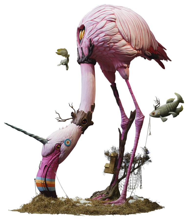 “The Giant Change is inspired by the Albufera Natural Park in Valencia, Spain. With this immersive experience, we share a story about the importance of protecting nature and wildlife. The Giant Change refers to the worldwide wetlands, and the problems they’re having due to droughts and climate change. The ecosystems where flamingos live, which are also home to many other animals and thousands of bird species, are threatened all around the world. Take a closer look at this installation’s intricate contours, and embark on a visual journey that narrates a compelling tale of our collective responsibility to safeguard nature and its awe-inspiring biodiversity. Be captivated by the narrative woven into every curve, every shade, and every feather of this monumental sculpture. Your presence adds another layer to the evolving story of art as a catalyst for change.” / Dulk