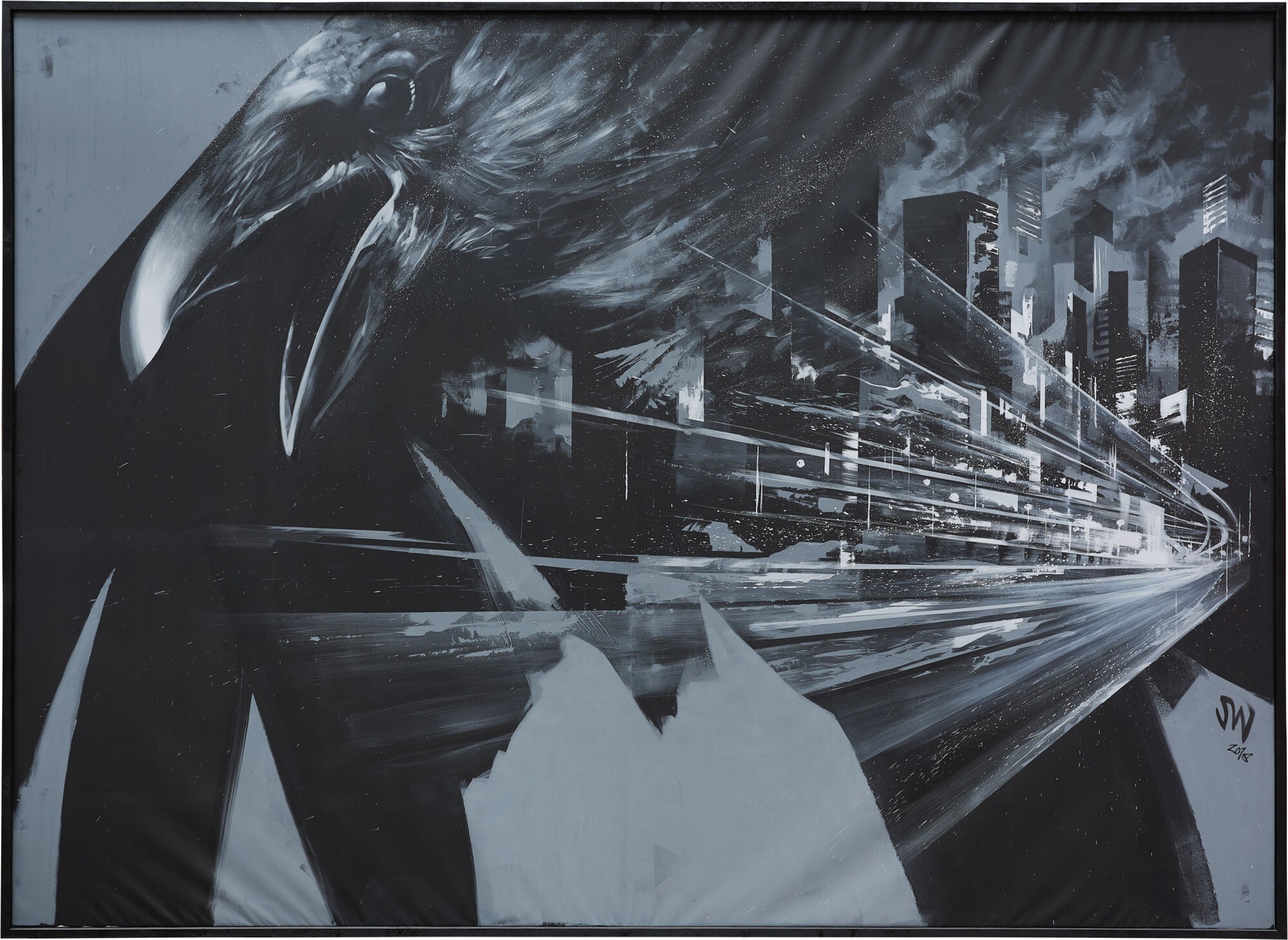 A crow sits atop TOODAY – Out of Focus. This is a reoccurring figure in Sidney’s work, a representation of the artist looking down at the world beneath him. From the crow’s point of view, the world moves so fast that city lights are blurred, everything out of focus. This is the view of our own fast-paced lives.