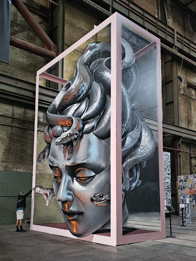 “Coming here, I really wanted to challenge myself to create something unique. I think this is one of my best anamorphic works to date. There is a double meaning to the snakes surrounding Medusa. On the one hand, they represent dark thoughts and anger let loose. But at the same time, they can protect you from negative energies.” / Odeith