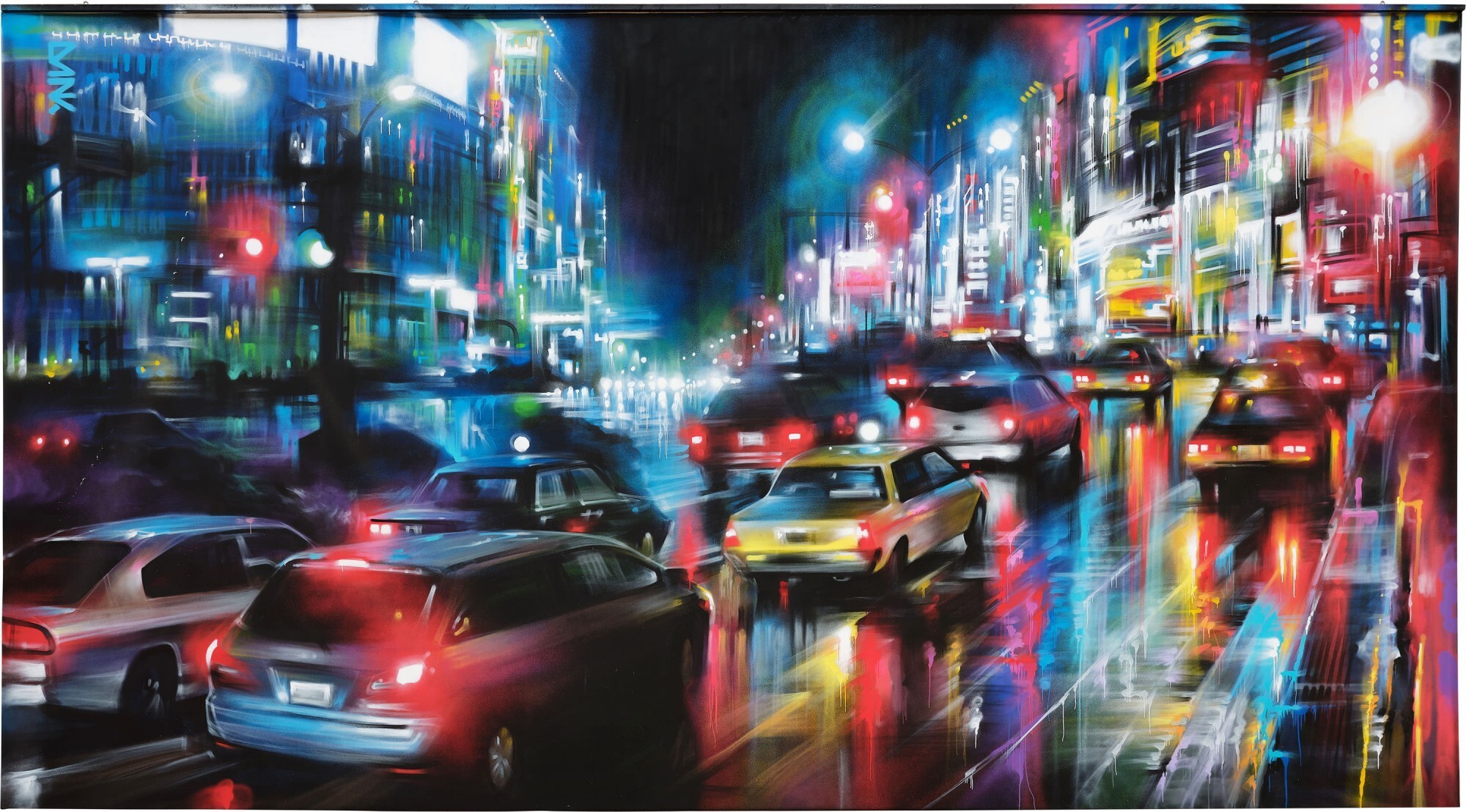 Dan Kitchener brings the city to the foreground in such a way that it completely dominates his compositions. Dan constantly captures the energy of the city through its lighting and bustle. He always tries to recreate the atmosphere of a place as he experienced it. The wet streets and crowded neon signs are actual urban elements recorded by the artist on site through photographs and sketches.