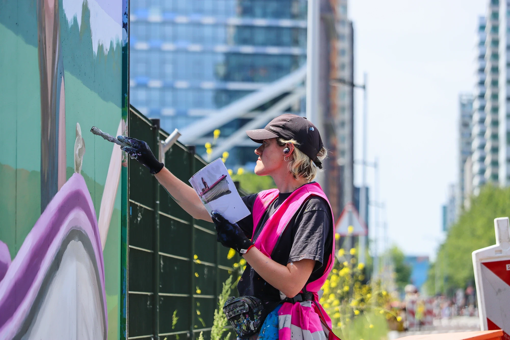 Jelmer Konjo is een beeldend kunstenaar en muralist wiens werk een krachtige grafische taal combineert met levendige, door de straatcultuur geĆÆnspireerde energie. Zijn dynamische composities zijn gebaseerd op de texturen en ritmes van het stedelijke leven en brengen abstractie, speelsheid en verhalende elementen in balans.